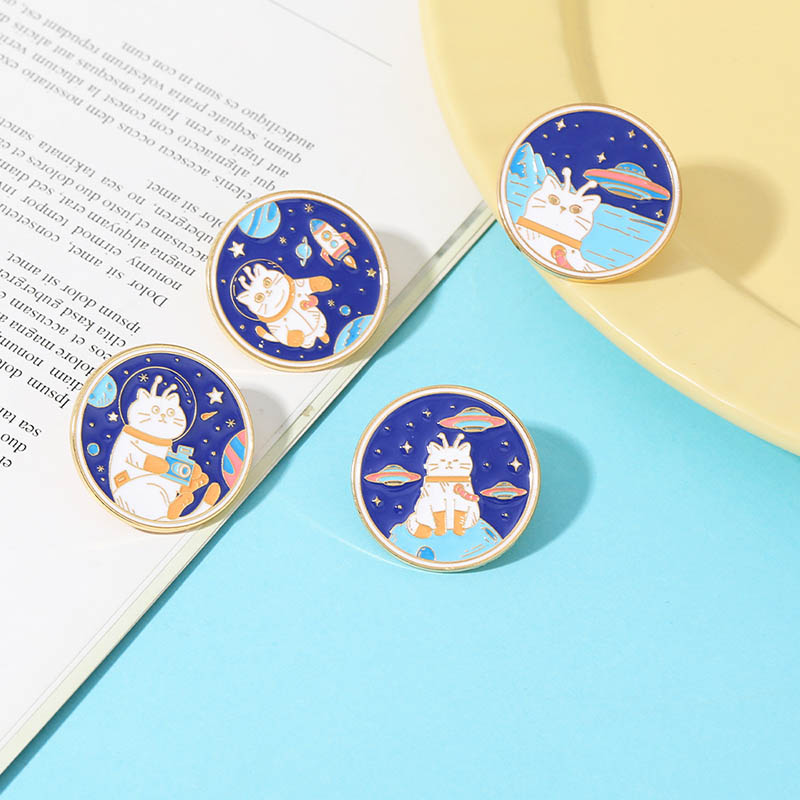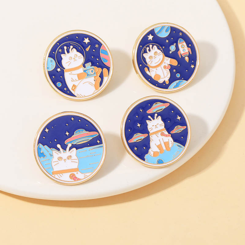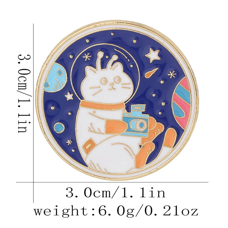 This space cat pin set has 4 glossy astronaut cat designs (photographing, floating, exploring) in starry cosmic backdrops—whimsical, galactic, cute. For cat/space fans, it adds playful cosmic flair to bags/jackets, ideal for daily styling or charming space-themed accessory decor.