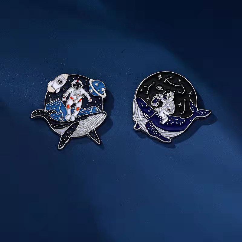 These 5 dreamy pins blend cosmic wonder (astronauts, stars) with ocean charm (whales)—intricate details (space jars, whale-back space rides) + glossy enamel bring their whimsical vibe to life. Ideal for space/whale lovers to add ethereal flair to bags/jackets; great for showcasing celestial collectibles.