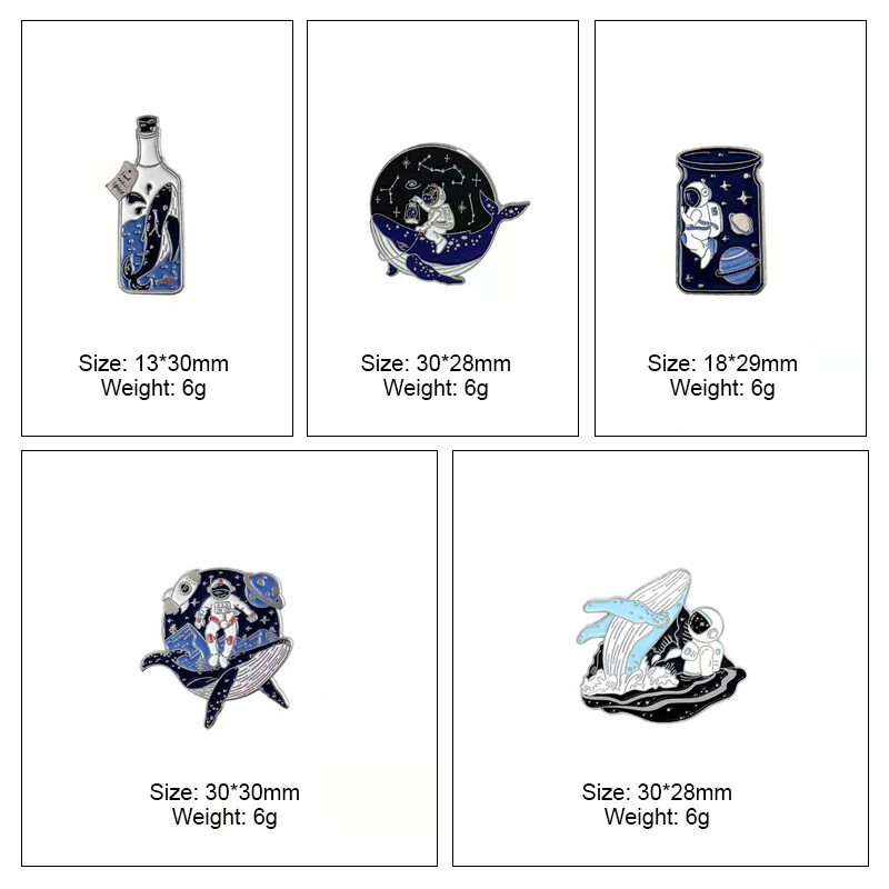 5 dreamy pins (astronauts + whales in space/jars) — glossy enamel, intricate cosmic details. Perfect for space/whale lovers to add whimsical flair to bags/jackets; ideal for daily wear or celestial collectible decor.