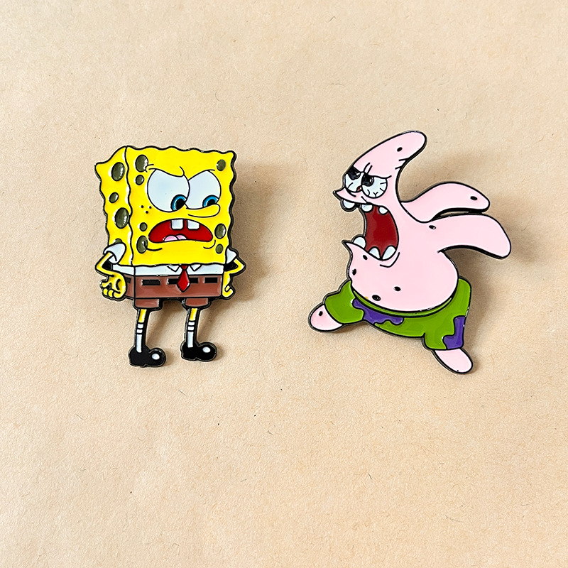 Features iconic SpongeBob/Patrick in lively angry poses with vivid enamel. Ideal for cartoon fans to add nostalgic, playful flair to bags, jackets, or hats—perfect for fandom styling or casual accessory accents.
