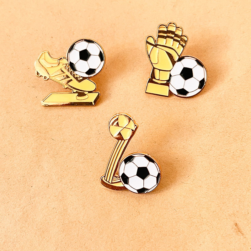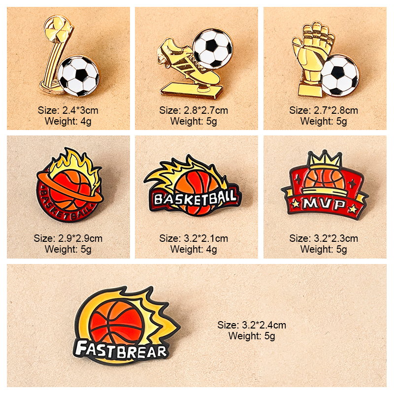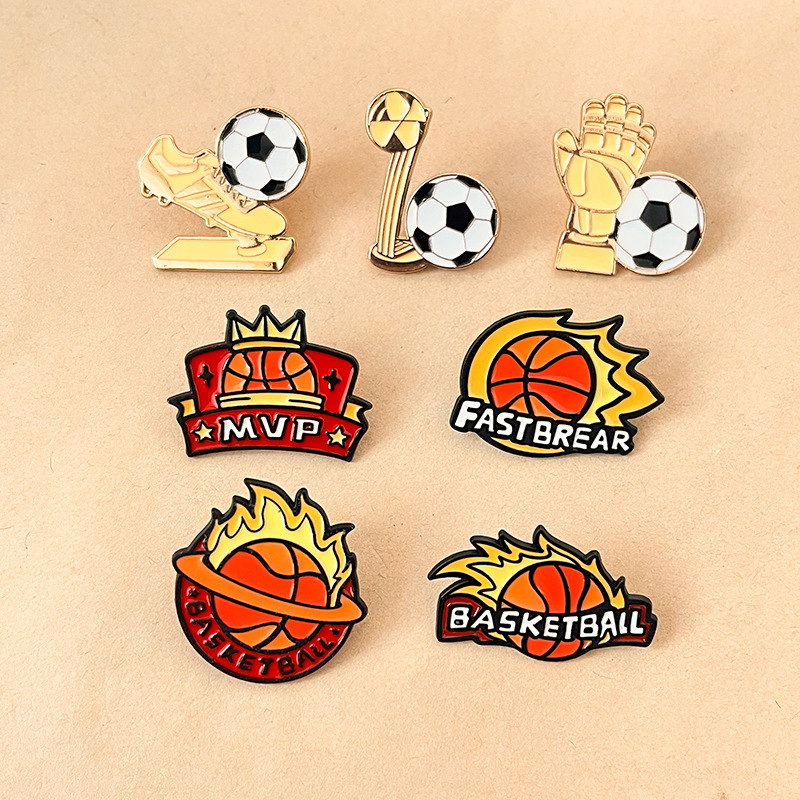 These sports pins come in varied shapes (soccer shoe/trophy, basketball MVP badge/flame design) with bold, glossy detailing. They adorn bags, jackets, or caps—perfect for soccer/basketball fans to showcase team spirit and energetic flair in daily or game-day looks.