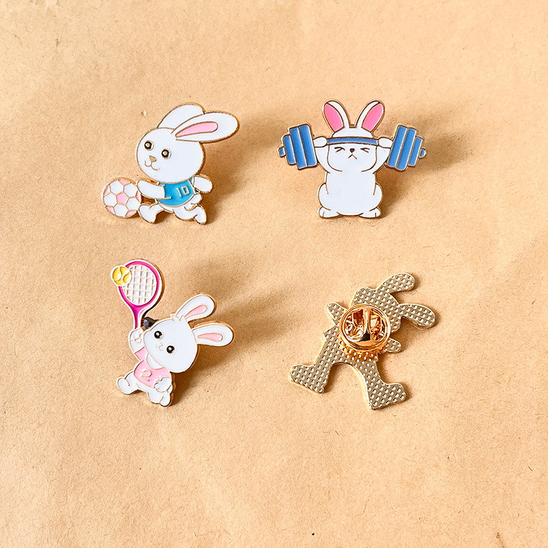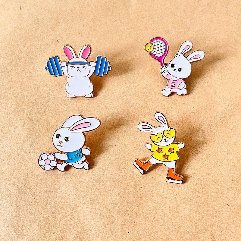These vibrant enamel pins (crisp metal outlines) feature bunnies in 4 sports: tennis, soccer, weightlifting, skating—blending cute animal charm with lively athletic vibes. Perfect for adding cheerful, sporty flair to bags/jackets or collecting as fun active-themed keepsakes.