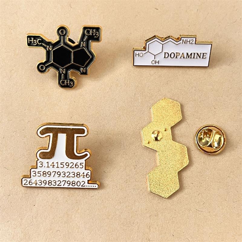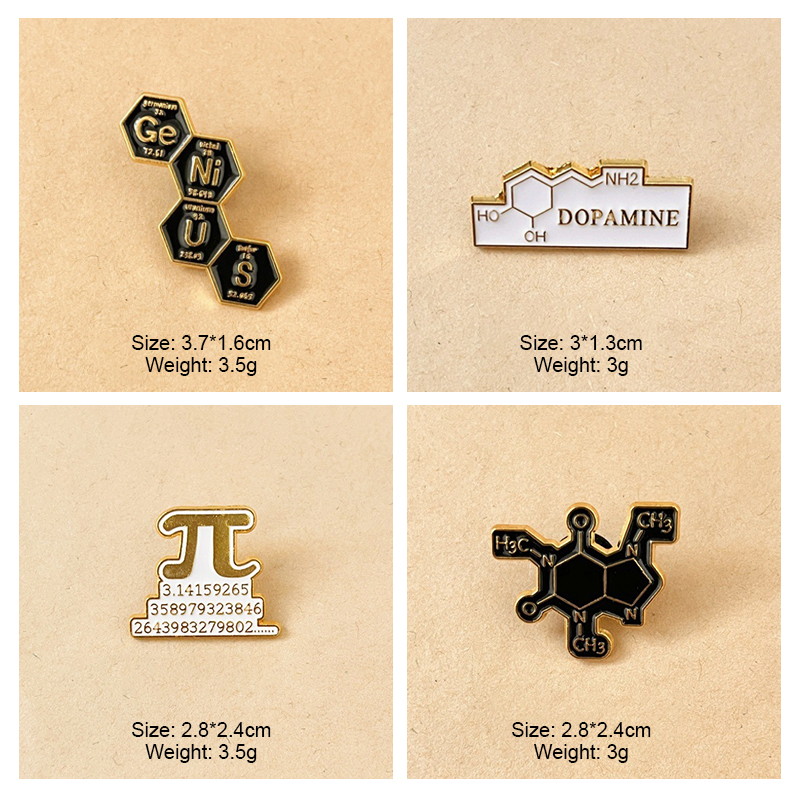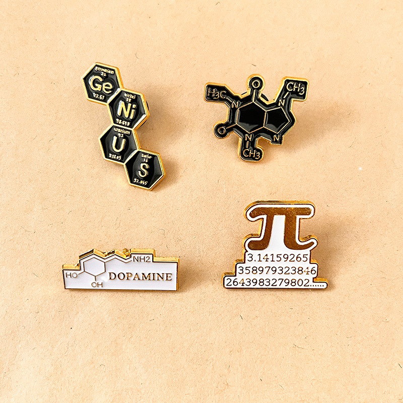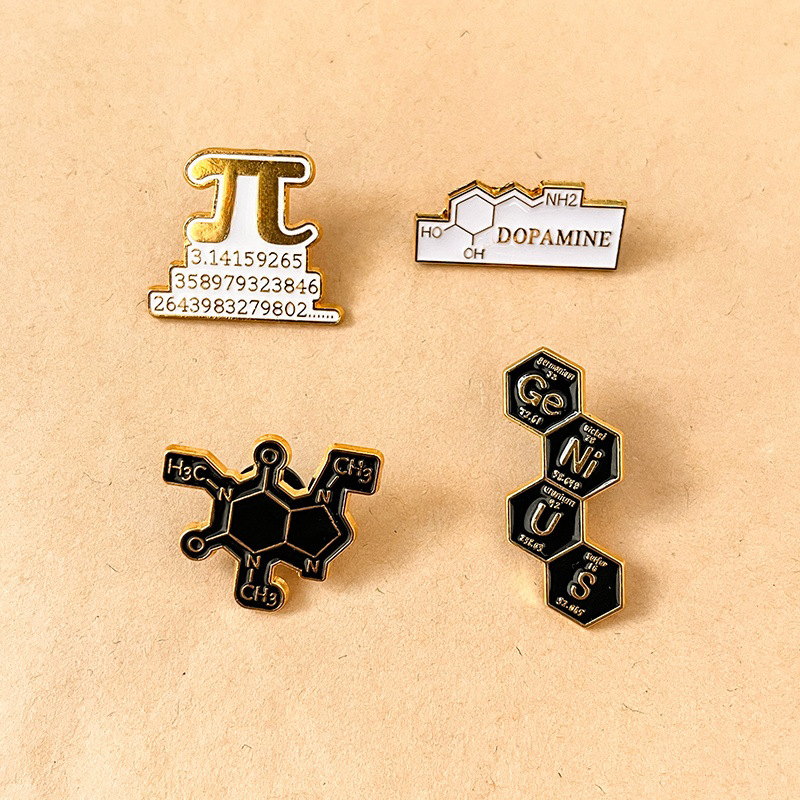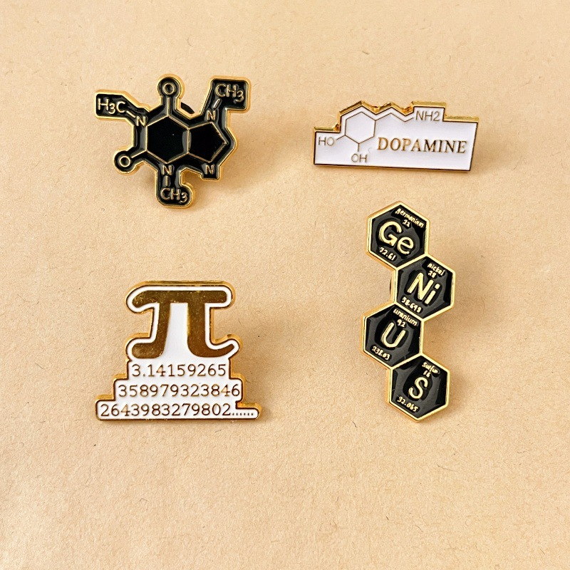 These STEM pins come in varied shapes (molecule, periodic table tiles, π symbol) with glossy black-gold detailing. They adorn bags, jackets, or lab gear—perfect for science/math enthusiasts to add witty, intellectual flair to daily or academic items.