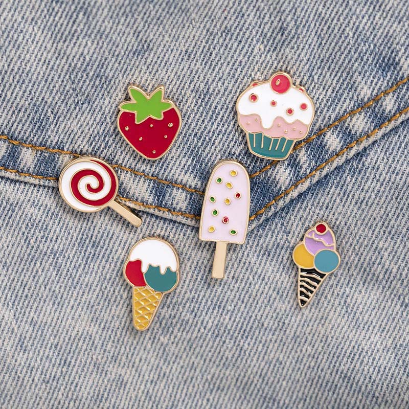 This sweet treats pin set has 5 glossy designs (lollipop, cupcake, strawberry, popsicle, ice cream)—colorful, playful nods to desserts. For sweet lovers, it adds cheerful flair to bags/jackets, ideal for daily styling or charming sweet-themed accessory decor.