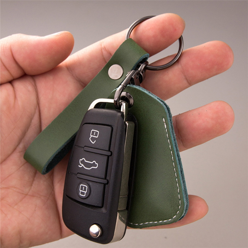 These keychains feature teardrop-shaped leather charms in red, teal, green, brown, black, and yellow, paired with matching leather straps and metal key rings. They showcase a stylish, durable design, ideal as colorful and practical accessories.