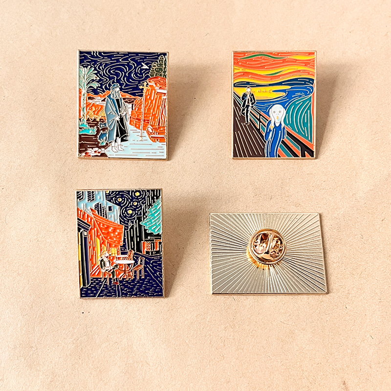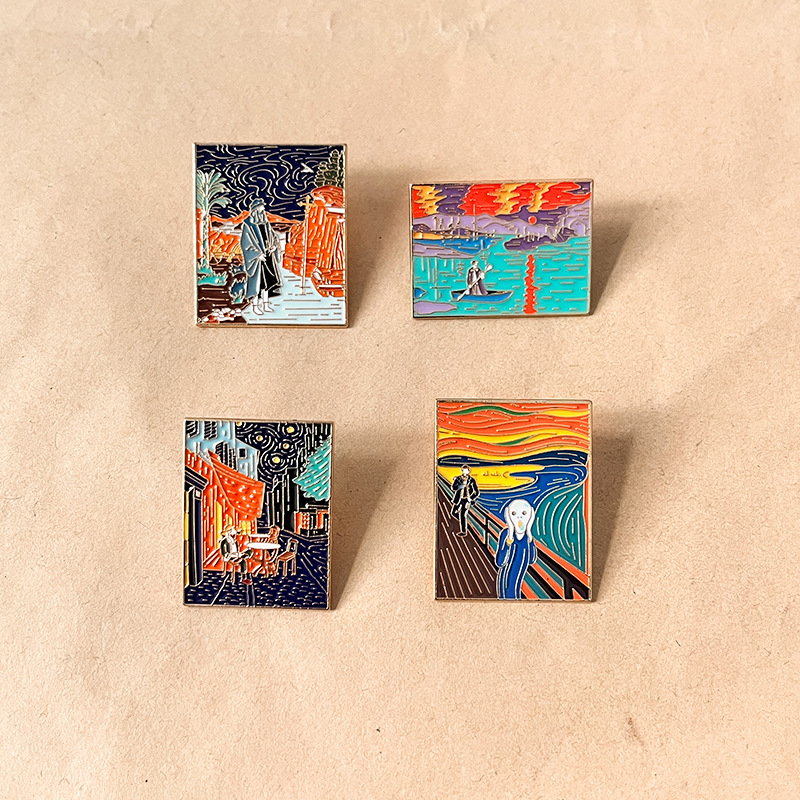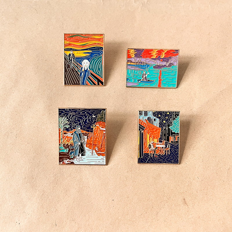 4 vivid pins reimagine classic art (like The Scream, Van Gogh scenes) with bold, post-impressionist hues—intricate details capture artistic flair. Perfect for art lovers to adorn bags/jackets or display as cultured collectibles.