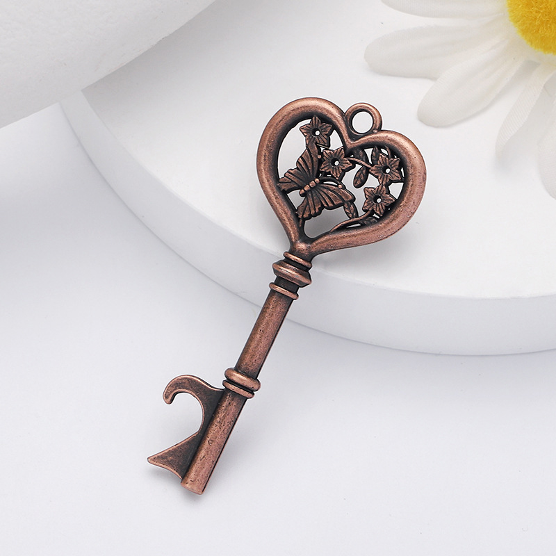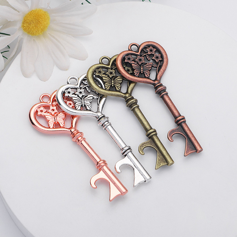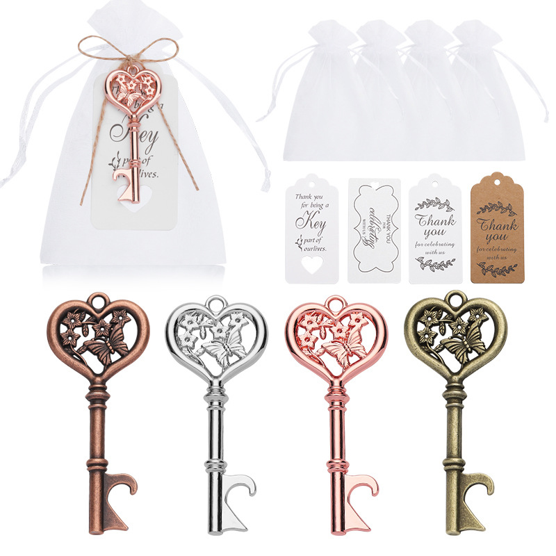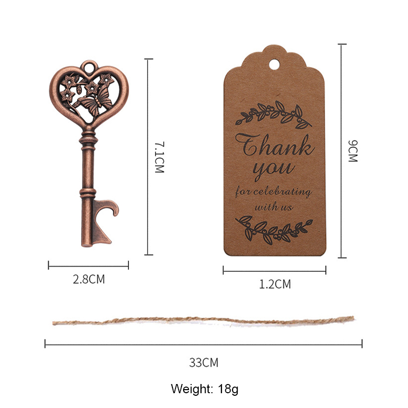 This 18g (7.1cm) opener mimics a vintage key, with a heart-shaped top etched with butterflies/flowers, available in copper/silver/rose gold. It pops caps easily, making it a romantic favor for weddings, bridal showers, packaged with a "Thank You" tag.