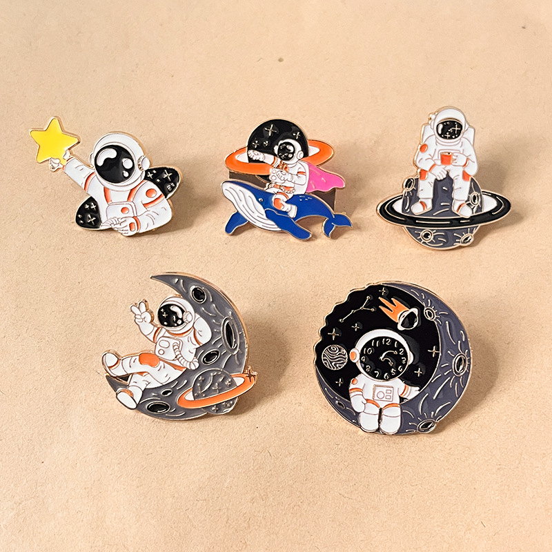 5 playful pins feature astronauts (holding a star, riding a whale, on a planet, lounging on the moon, with a moon clock)—blending cosmic charm and quirky creativity. Perfect for adding space flair to bags/jackets or collecting as lively aerospace keepsakes.