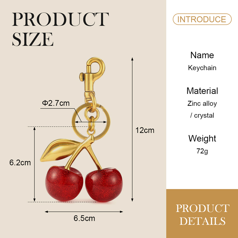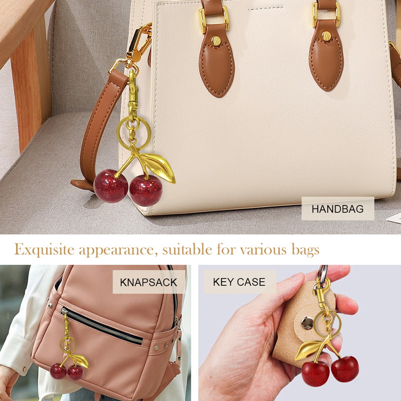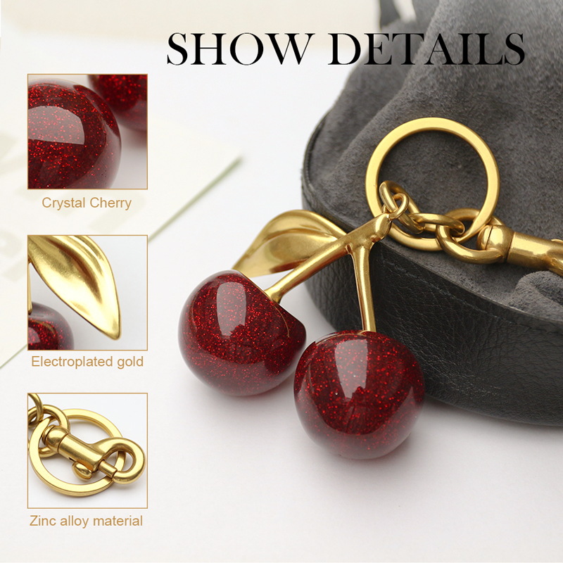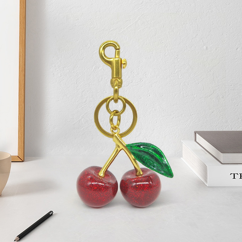 This keychain features glittering resin cherries with a glossy, sparkly finish, paired with gold-tone metal hardware. Its cute, playful design blends whimsical charm and trendy aesthetics, making it a fashionable, eye-catching accessory for women who love sweet, vibrant styles.